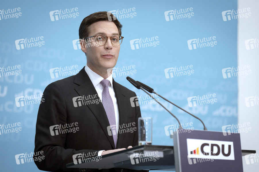 Manuel Hagel bei der Pressekonferenz zu den Ergebnissen der Gremiensitzungen der CDU im Konrad-Adenauer-Haus. Berlin, 09.03.2026