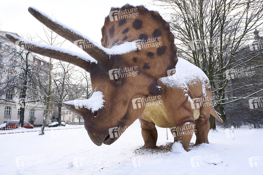 Verschneiter Dinosaurier am Landesmuseum zur Sonderausstellung 'Kinoaaurier. Zwischen Fantasie und Forschung'. Hannover, 30.01.2021