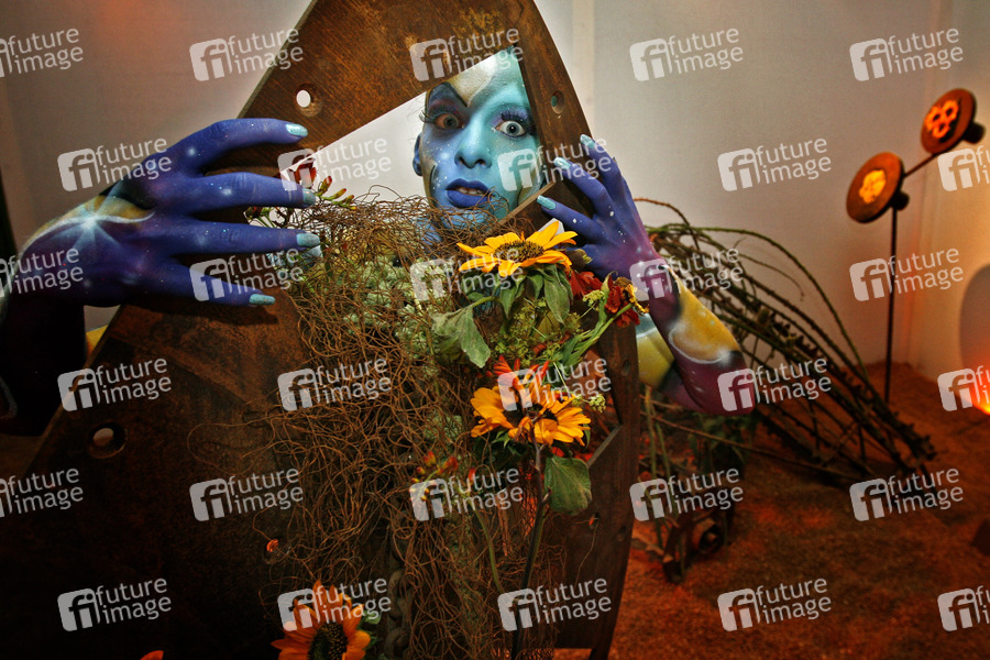 Bodypainting und Fotoshooting mit Model Sarah am Tag der offenen Tür der Meisterschule Justus-von-Liebig-Schule, Abteilung Floristik in Hannover-Ahlem. Künstler: Jörg Düsterwald