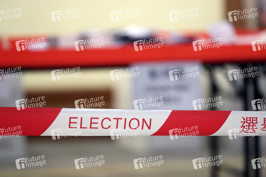Absperrung vor der Auszähltisch - Gewaltloses Wochenende in Hongkong. Fast 3 Millionen Hongkonger Bürger haben im Rahmen eines Referendums ihre Stimme abgegeben. Die Wahlbeteiligung wurde mit 71,2% von 4,1 Millionen Wahlberechtigten bestätigt. Es wird als Stimmungsbarometer zwischen dem Pro-Demokratie-Lager und dem Pro-Peking-Lager nach mehr als fünf Monaten des Aufruhrs in der Stadt angesehen. Das demokratische Lager in Hongkong hat bei den Bezirkswahlen einen klaren Sieg errungen. Hongkong, 24.11.2019