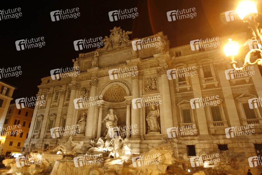 größter Brunnen Roms und einer der bekanntesten Brunnen der Welt, 26 Meter hoch, 50 Meter breit, eingeweiht 1735, besteht aus einer Palastfassade mit Triumphbogen, davor tummeln sich Meeresgestalten auf einer Felslandschaft, Fabelwesen des Meeres, Meerespferde, Tritonen, im Zentrum der herrschaftliche Meeresgott Oceanus, Nachtaufnahme