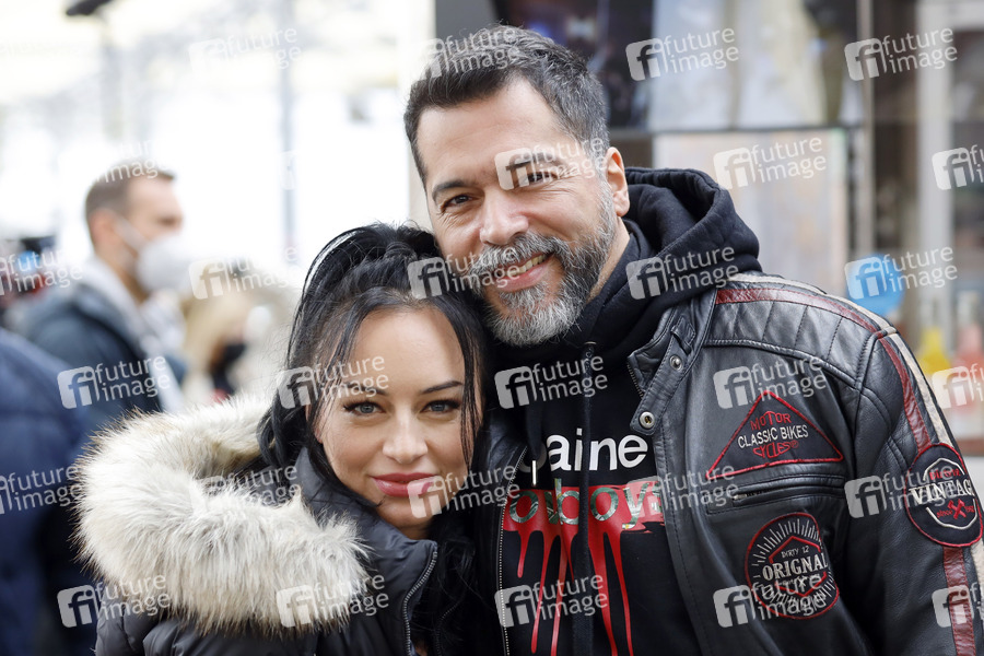 Aurelio Savina mit Freundin Larissa bei der Eröffnung von 'Willi Herren's Rievkooche Bud'. Willi Herren stellt seinen Reibekuchen-Truck am Gelände der Selgros vor. Köln, 16.04.2021
