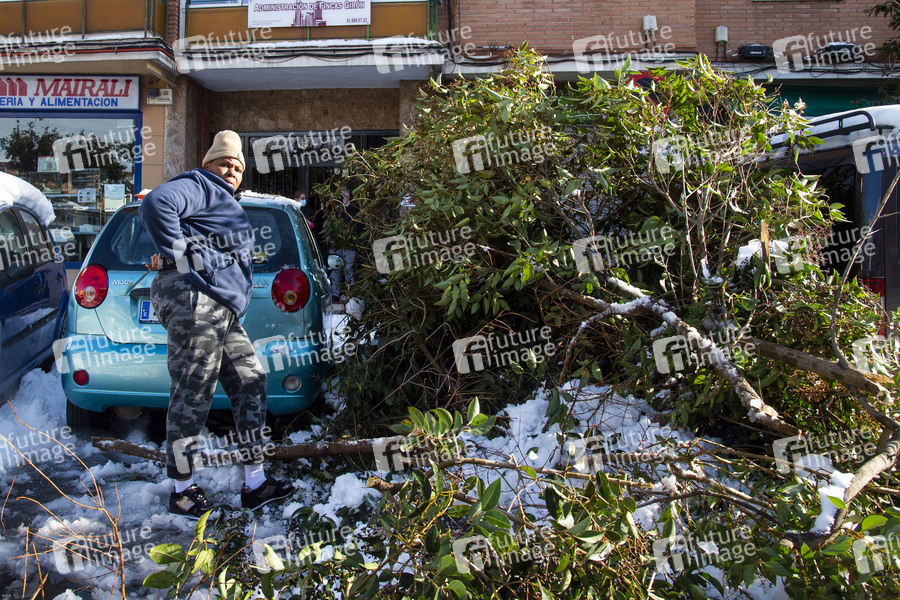 Umgestützter Baum - Die Region Madrid nach dem Sturmtief Filomena, das in weiten Teilen Spaniens mit starken Schneefällen für Chaos sorgte. Starker Schneefall legte das öffentliche Leben nahezu lahm. Seit 50 Jahren hatte es nicht so geschneit. Alcalá de Henares, 10.01.2021