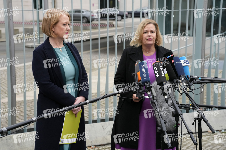 Lisa Paus und Nancy Faeser bei einer Pressekonferenz zum Nationalen Aktionsplan gegen Menschenhandel und Gewaltstrategien vor dem Bundeskanzleramt. Berlin, 11.12.2024