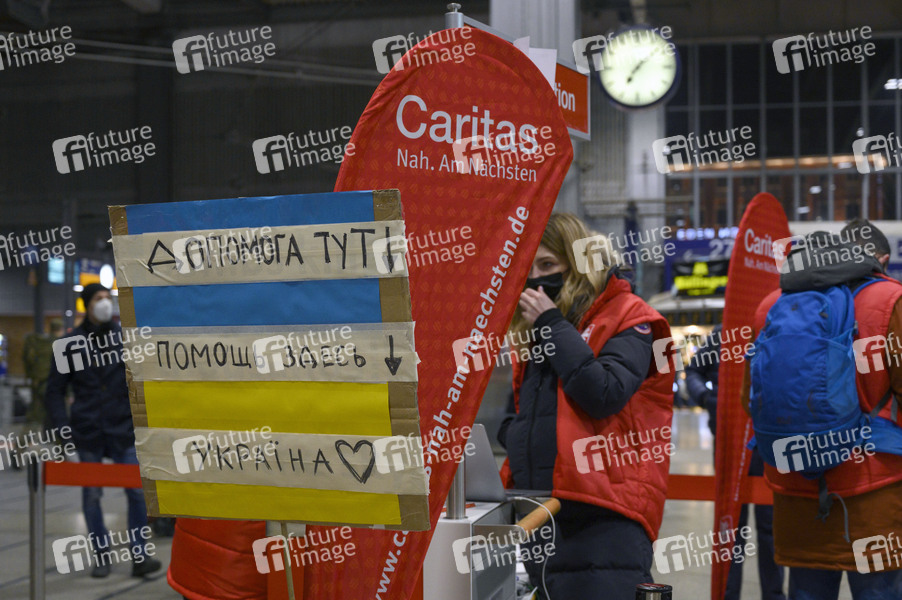 Mitarbeiter der Caritas empfangen Geflüchtete aus der Ukraine am Münchner Hauptbahnhof. München, 06.03.2022