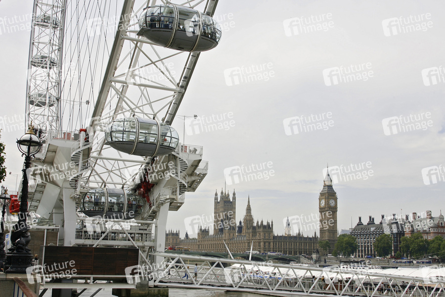 höchstes Riesenrad Europas, Höhe 135.36 Meter, das Riesenrad wurde von den Architekten David Marks und Julia Barfield entworfen, das Design der Gondeln stammt von Nick Bailey, Eröffnung 1999, 32 vollklimatisierte fast vollständig aus Glas geformte Gondeln, Platz für jeweils bis zu 25 Personen, das Rad dreht sich mit einer Geschwindigkeit von 0.26 m/s und braucht für eine Umdrehung 40 Minuten, bis zum 4. Januar 2004 das höchste Riesenrad der Welt, Big Ben, Houses of Parliament