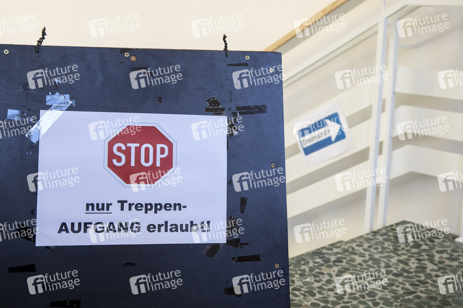 Schulbeginn, Pfingstferien, Kombination, Präsenzunterricht, Homeschooling, Kultusministerium, Kontaktbeschränkung, Hinweisschilder, schrittweise Öffnung, Abstandsregeln, Abstandsregelung, Rückgang zur Normalität, Hoffnungen, Corona, Sars-CoV-2, Covid-19, Coronavirus, Coronaviren, Corona-Virus, Coronakrise, Corona-Krise, Corona-Pandemie, Coronamaßnahmen, Corona-Schutz, Exit-Strategie, Ausnahmesituation, Treppe, Laufrichtung, Symbolfoto, Symbolbild