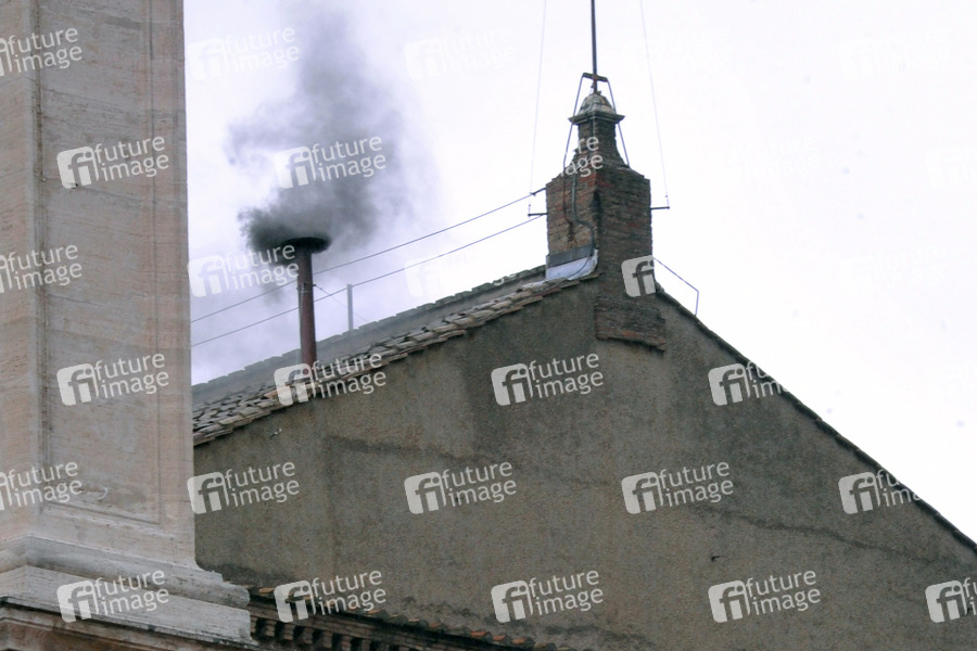 Schwarzer Rauch steigt aus dem Schornstein der Sixtinischen Kapelle, der anzeigt, dass die Kardinäle noch zu keinem Ergebnis bei ihrer Papstwahl gekommen sind. Vatikanstadt, 13.03.2013