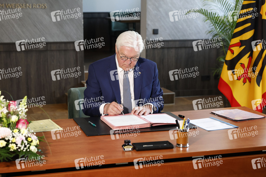 Frank-Walter Steinmeier arbeitet an seinem zeitweiligen Amtssitz im Hotel Zum Weissen Ross in Delitzsch. Steinmeier verlegt seinen Amtssitz für drei Tage nach Sachsen. Der Besuch im Landkreis Nordsachsen ist Teil der Reihe 'Ortszeit Deutschland', bei der das Staatsoberhaupt regelmäßig in verschiedene Regionen reist, um mit Bürgerinnen und Bürgern ins Gespräch zu kommen und die Entwicklung vor Ort kennenzulernen. Delitzsch, 20.05.2025