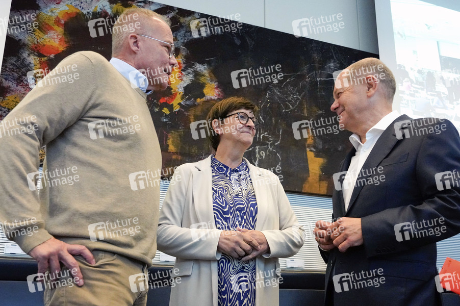 Matthias Miersch, Saskia Esken und Olaf Scholz bei der Fraktionssitzung der SPD-Bundestagsfraktion im Reichstagsgebäude. Berlin, 24.09.2024
