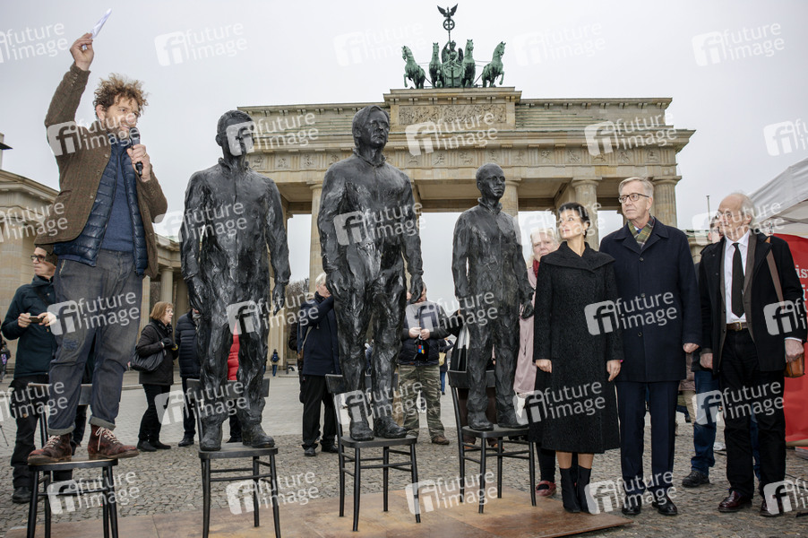 Davide Dormino mit Sahra Wagenknecht und Dietmar Bartsch bei der Enthüllung der Skupltur 'Anything to say?' des italienischen Künstlers und Bildhauers Davide Dormino, die den Mut der Whistlebower Assange, Manning und Snowden würdigen und daran erinnern sollen, wie wichtig es ist, die Wahrheit zu kennen. Berlin, 28.11.2019