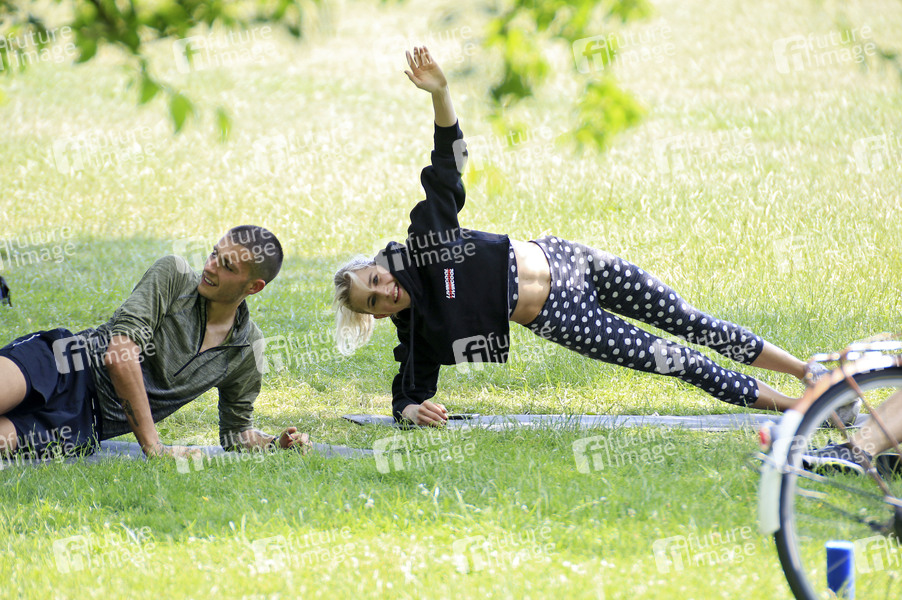 Caro Daur und Fitnesscoach Marcus zu Solms veranstalten auf einer Wiese an der Alster in Hamburg ein Charity Fitness Workout, um Spenden für Menschen in Yemen zu sammeln. Bisher kamen mehr als 15.000 Euro zusammen. Hamburg, 27.06.2020