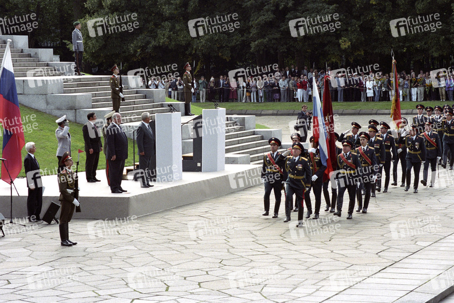 Helmut Kohl und Boris N. Jelzin bei der Militärparade zur Verabschiedung der russischen Streitkräfte aus Deutschland am sowjetischen Ehrenmal in Berlin-Treptow. Berlin, 31.08.1994
