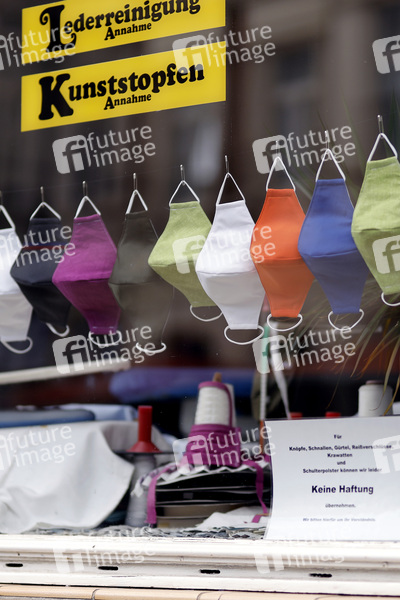 Verschiedene Masken aus Stoff hängen im Fenster einer Schneiderei. Bonn, 03.07.2020