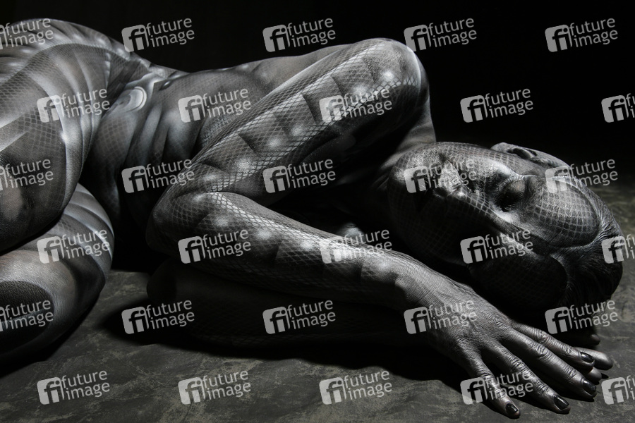 Bodypainting, Erotik, Frau, nackt, drinnen, weiblich, Monster, Außerirdische, Alien, Echse, Körperkunst, Kunst, Malerei, monochrom, Schlaf, erotic, woman, nude, indoor, female, monochrome, lizard, body art, body painting, sleep