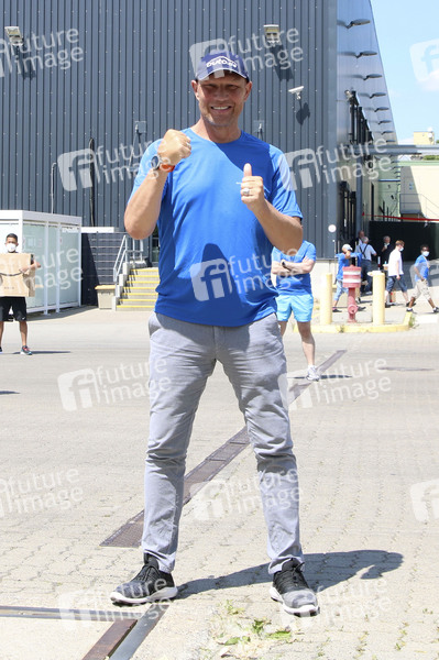 Axel Schulz mit Amazon-Läufern. Zahlreiche Mitarbeiter aus vier Amazon Verteilzentren in Berlin/Brandenburg laufen eine Woche lang gemeinsam für den guten Zweck. Für jeden gelaufenen Kilometer spendet Amazon einen Euro an die Arche, um damit die nachhaltige Arbeit zugunsten benachteiligter Kinder und Jugendlicher zu fördern. Bei der Charity-Aktion wird diesmal mit einer Spendensumme in Höhe von insgesamt 18.000 Euro gerechnet. Vor dem finalen Lauf am Borsigturm in Berlin-Tegel gibt Boxlegende Axel Schulz den Läufern und Läuferinnen Tipps aus seiner Erfahrung als Sportler und nimmt von Amazon-Standortleiter Tim Stapf den Spendenscheck für die Arche entgegennehmen. Berlin, 11.06.2021