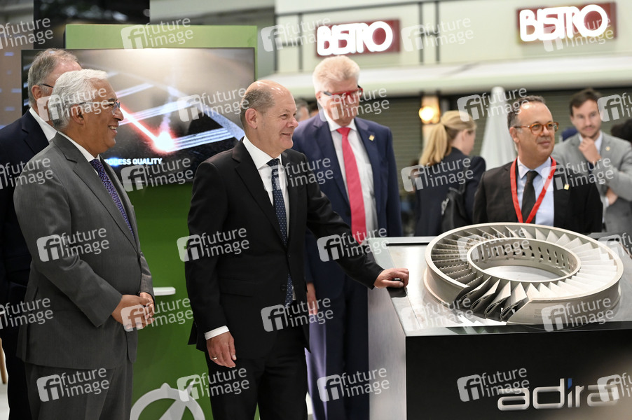 Antonio Costa und Olaf Scholz beim Eröffnungsrundgang am Stand von Adira auf der Hannover Messe 2022 auf dem Messegelände. Hannover, 30.05.2022