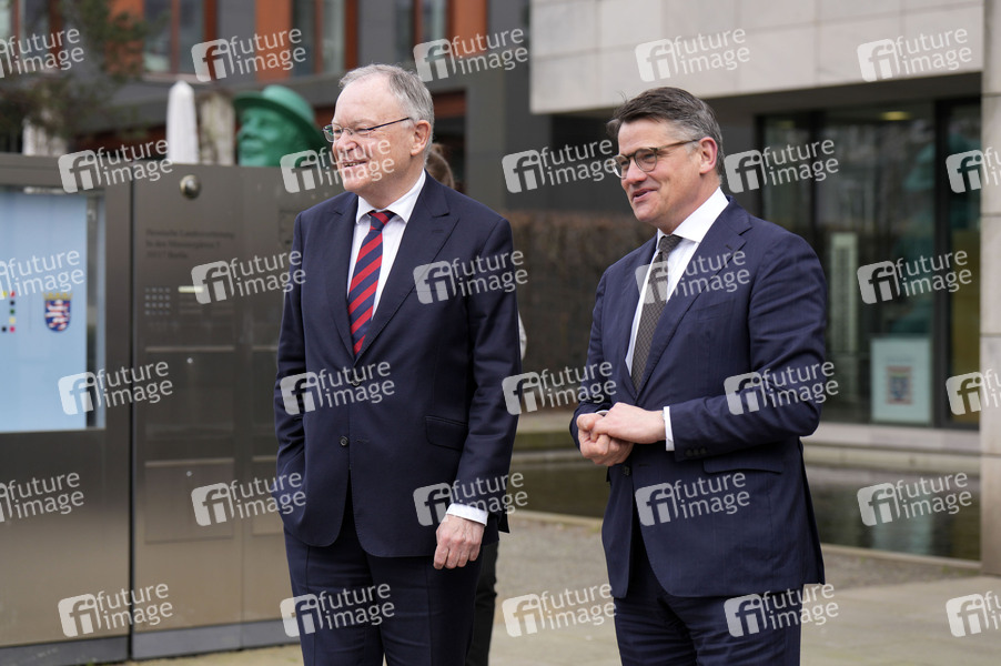 Stephan Weil und Boris Rhein bei der Ministerpräsidentenkonferenz in der Vertretung des Landes Hessen beim Bund. Berlin, 06.03.2024