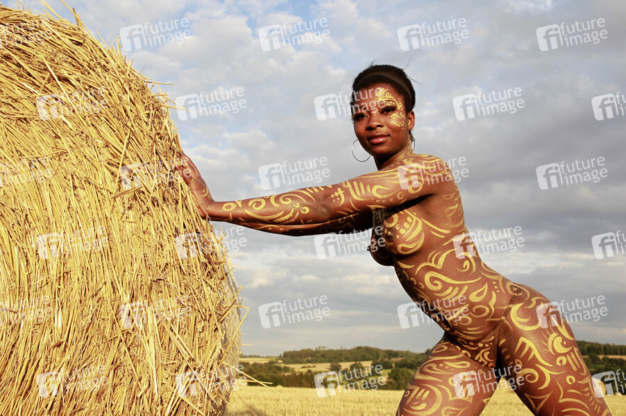Bodypainting, Erotik, Frau, Mädchen, Afrikanerien, nackt, draußen, weiblich, Körperkunst, Kunst, Ornamente, Malerei, Feld, Acker, Stoppelfeld, Heuballen, Stroh, Landwirtschaft, Ernte, Abendsonne, erotic, African woman, girl, nude, outdoor, female, body art, body painting, ornaments, field, hay, straw, farming, harvest, evening sun