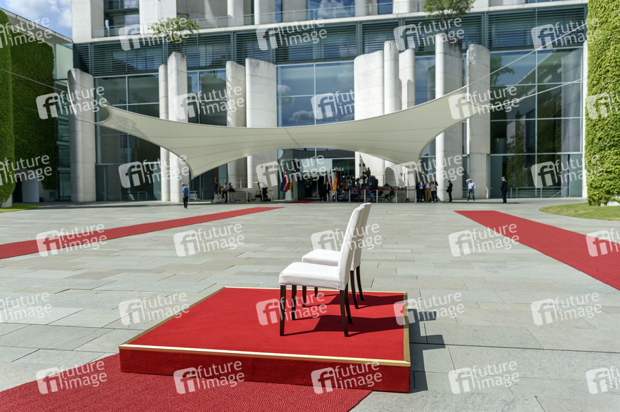 Beim Empfang mit militärischen Ehren für die dänische Ministerpräsidenten stehen Stühle im Hof des Bundeskanzleramts bereit. Berlin, 11.07.2017