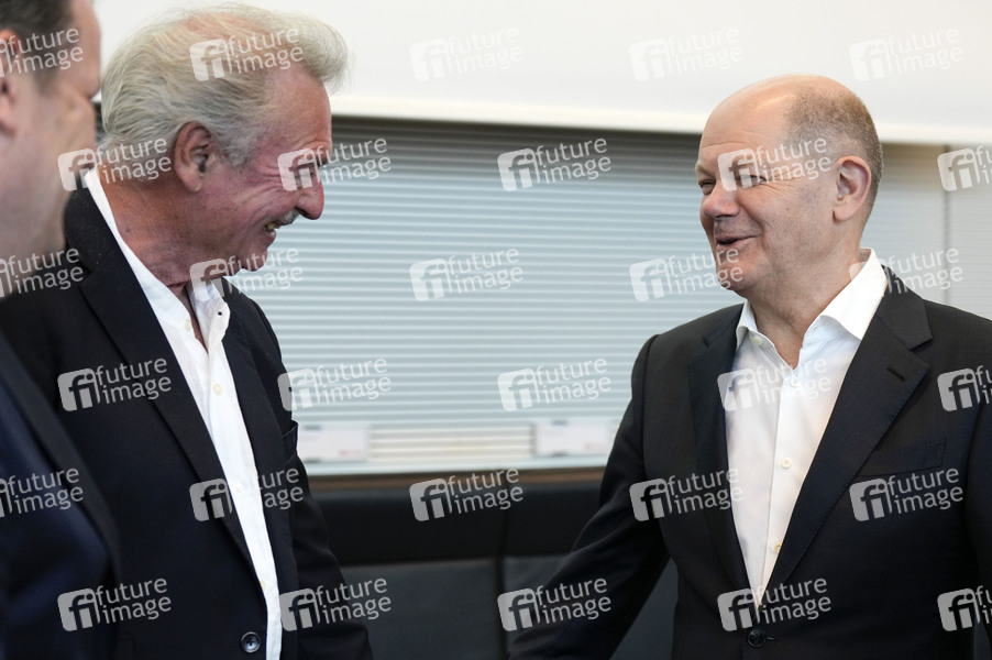 Jean Asselborn und Olaf Scholz bei der Fraktionssitzung der SPD-Bundestagsfraktion im Reichstagsgebäude. Berlin, 23.04.2024