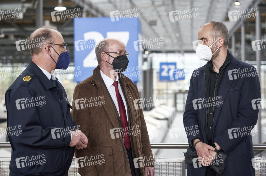 Dieter Rohrberg (Leiter der Feuerwehr Hannover), Volker Kluwe (Polizeipräsident der Polizeidirektion Hannover) und Belit Onay (Oberbürgermeister der Landeshauptstadt Hannover) - Zeltdörfer-Unterkünfte für ukrainische Kriegsflüchtlinge in der Halle 27 auf dem Messegelände, inklusive Wasch- und Duschmöglichkeiten, errichtet von der Feuerwehr Hannover. Die spätere Versorgung erfolgt durch das DRK. Hannover, 06.03.2022
