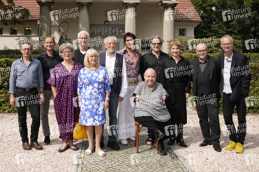 Boris Aljinovic, Philipp Tiedemann, Peggy Lukac, Folke Braband, Dagmar Biener, Dieter Hallervorden, Nils Strassburg, Thomas Quasthoff, Anatol Preissler, Antje Rietz, Frank-Lorenz Engel und Thomas Schmidt-Ott bei der Jahres-Pressekonferenz zur 15. Spielzeit 2023/2024 im Schlosspark Theater. Berlin, 01.09.2023
