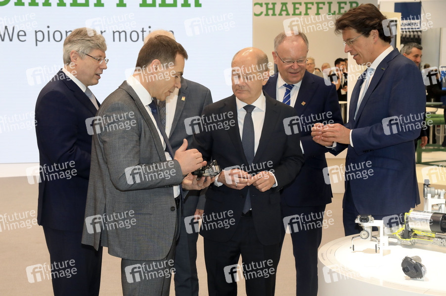 Deutsche Messe AG, Hannover Messe Industrie, Weltleitmesse der Industrie, Industriemesse, Industrieschau, Automatisierung, IT-Sicherheit, KI, Technologie, Wirtschaft, Ausstellung, Fair, Messe, Eröffnung, Opening, Leitmesse, Synergie und Kooperation, Wasserstoff & Brennstoffzellen, CO2-neutrale Produktion, Energizing a Sustainable Industry, Künstliche Intelligenz, Partnerland Kanada, Politiker, Bundeskanzler, Ministerpräsident von Niedersachsen, Vorsitzender des Vorstands der Schaeffler AG