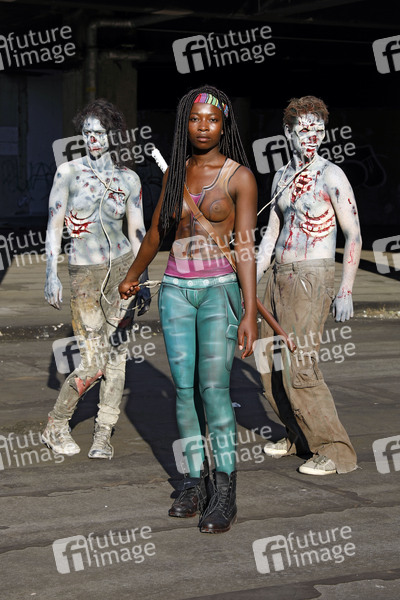 Bodypainting, Body-Painting, nackt, Cosplayer, Cosplay, Körperkunst, Körperfarben, Farbe, Bemalung, Kunst, Malerei, Horror, Endzeit, zombifiziert, Untote, Ruine, Beißer, Streuner, lebende Tote, Zombie-Jäger, Fantastic, body painting, nude, body art, colors, walker, biter, ruin, Zombie hunter, The Walking Dead, The Living Dead