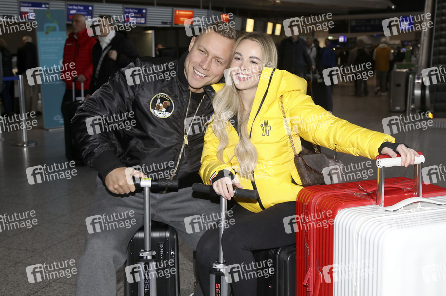 Patrick Romer mit Freundin Annelie Henze bei der Abreise der Dschungelcamp-Kandidaten der RTL Reality-TV-Show 'Ich bin ein Star - holt mich hier raus' nach Australien auf dem Flughafen Frankfurt am Main. Frankfurt, 17.01.2026