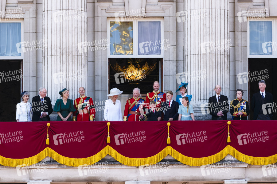 Buckingham Palace, Parade, Tradition, Geburtstag des Königs, Horse Guards Parade, Soldaten der Household Division, britische Infanterie- und Kavallerieregimenter mit Garderang, königliche Familie, British Royals, Prince Richard Duke of Gloucester, Birgitte Duchess of Gloucester, Sophie Duchess of Edinburgh, Prince Edward Duke of Edinburgh, Queen Camilla, King Charles III, Prince Louis, Prince William, Prince George, Catherine Princess of Wales, Princess Charlotte, Prince Edward, Duke of Kent, Princess Anne