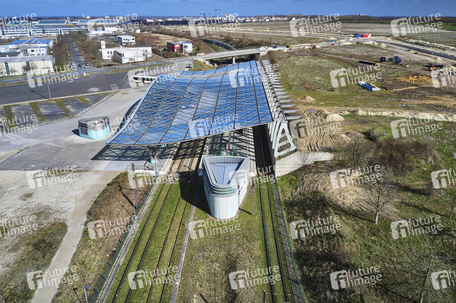 Luftbild, Expogelände, Expo-Park Hannover, Expo 2000, U-Bahn, üstra, GVH, Großraumverkehr, Haltestelle, Endhaltepunkt der Stadtbahn-Linie 6, Messe Hannover, Haltestelle Messe/Ost
