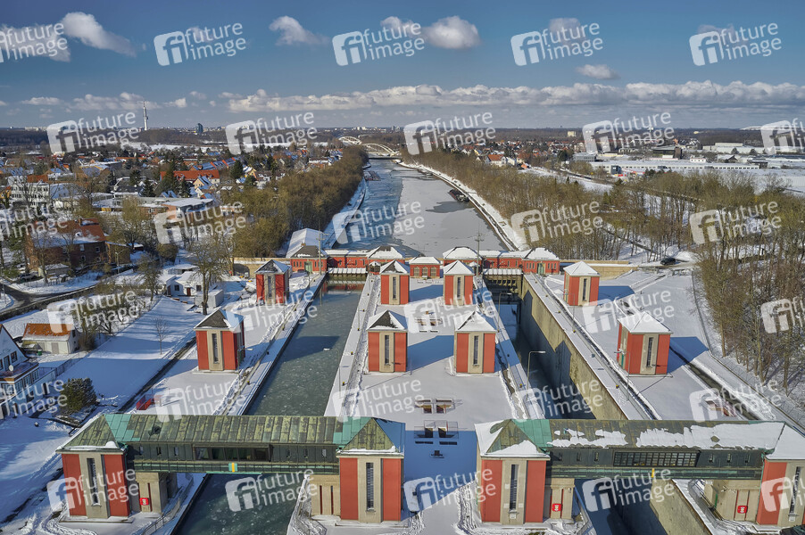 Schleuse Anderten, Wetter, verschneit, Schnee, Glätte, Eis, kalt, Wintereinbruch, Minustemperaturen, Winter, Winterwetter, Grenzwetterlage, Schneefälle, Schneefall, Frost, Wetterlage, Schiffahrt, Binnenschleuse, Kanal, Gewässer, Eisschollen, Drohne, Drohnen, Kameradrohne, Drohnenaufnahme