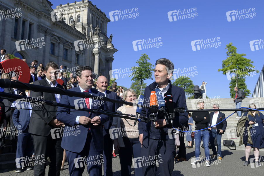 Lars Klingbeil, Hubertus Heil und Rolf Mützenich mit Gewerkschaftern und SPD-Mitgliedern bei einer Kundgebung zur Befürwortung des 12-Euro-Mindestlohns vor dem Reichstagsgebäude. Heute wird im Bundestag über den 12-Euro-Mindestlohn ab Oktober 2022 abgestimmt. Berlin, 03.06.2022