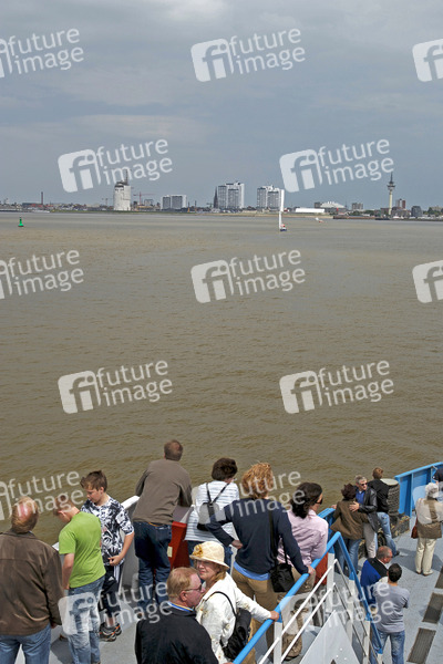 Passagiere auf einer Fähre nach Bremerhaven mit Skyline