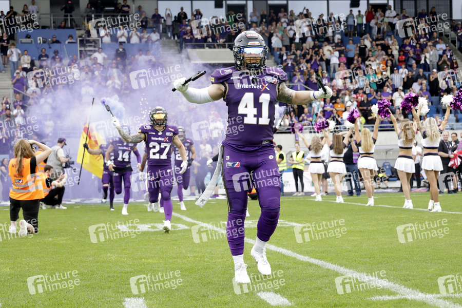 Joshua Poznanski (Frankfurt Galaxy DB), Thomas Fischbach (Frankfurt Galaxy Running Back) und Sebastian Gauthier (Frankfurt Galaxy LB) beim American Football-Spiel Frankfurt Galaxy gegen Hamburg Sea Devils in der PSD Bank Arena. Frankfurt am Main, 30.06.2024