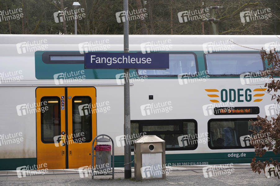 RE1 der ODEG am Bahnhof Fangschleuse. Die Erweiterungspläne für die Fabrik des Elektroautobauers Tesla in Grünheide (Oder-Spree) bei Berlin sind bei einer Einwohnerbefragung mehrheitlich auf Ablehnung gestoßen. Doch das Votum ist letztlich nicht bindend. Tesla will neben dem 300 Hektar großen Werksgelände einen Güterbahnhof, Lagerhallen und einen Betriebskindergarten errichten. Dafür müssten aber rund 100 Hektar Wald gerodet werden. Das ist umstritten. Es gibt Befürworter der Pläne, aber auch Ablehnung einer Tesla-Erweiterung (Quelle: rbb24). Grünheide, 23.02.2024