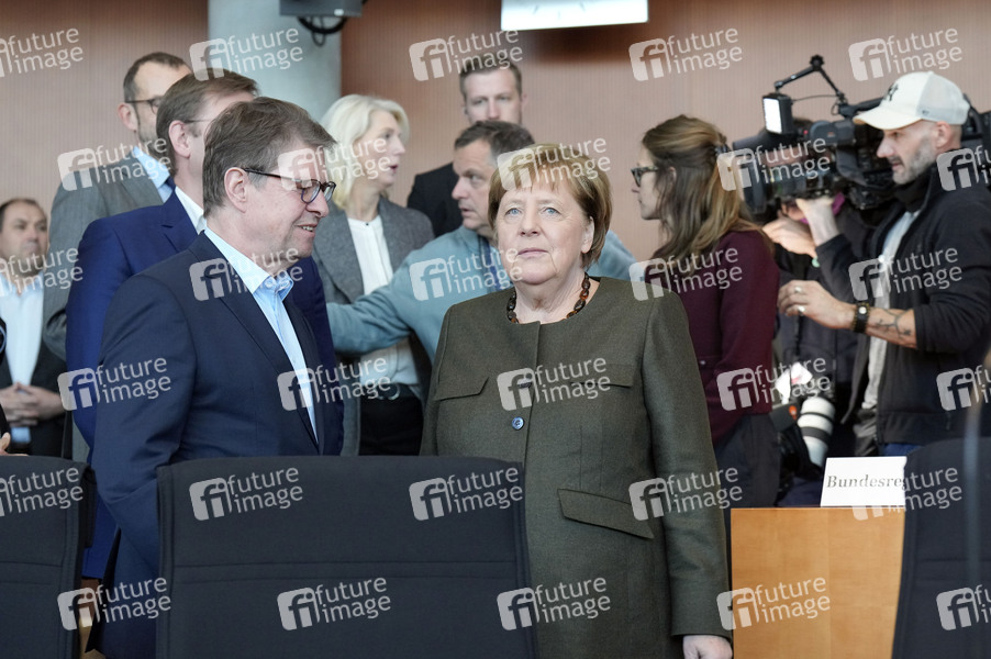 Ralf Stegner und Angela Merkel bei der öffentlichen Zeugenvernehmung des 1. Untersuchungsausschusses 'Afghanistan' im Paul-Löbe-Haus. Berlin, 05.12.2024