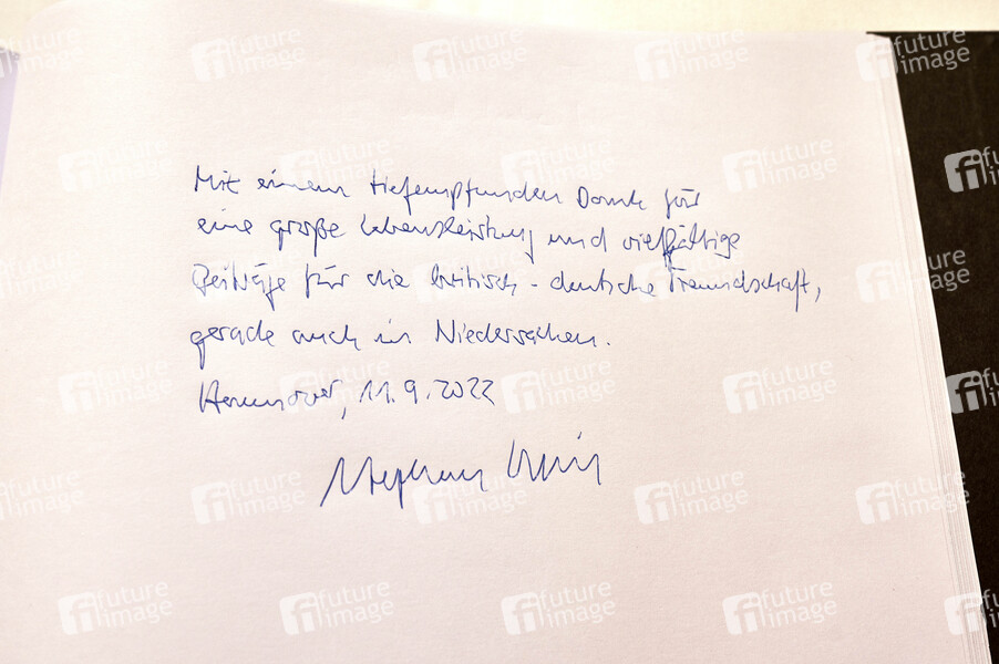 Ministerpräsident Stephan Weil trägt sich in das Kondolenzbuch für Queen Elisabeth II. im Neuen Rtahaus ein. Hannover, 11.09.2022