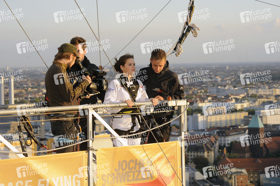 Base Flying von Jochen Schweizer mit den Hauptdarstellern von 'Gangs' auf dem Park Inn Hotel am Alexanderplatz in Berlin