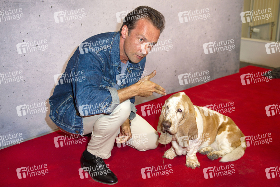 Lucas Gregorowicz mit Basset Antonia bei der Preview des ARD-Krimis 'Polizeiruf 110 - Heimatliebe' im Cinema Paris. Berlin, 20.08.2019