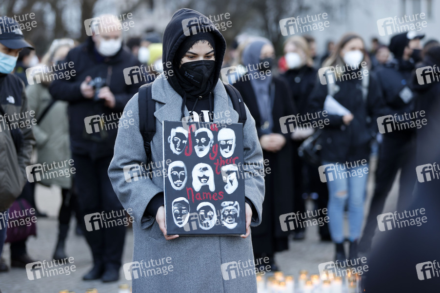 Gedenkveranstaltung zum ersten Jahrestag des rassistischen Anschlags in Hanau am Oranienplatz. Vor einem Jahr tötete ein Rechtsextremist in Hanau zehn Menschen und sich selbst. Berlin, 19.02.2021