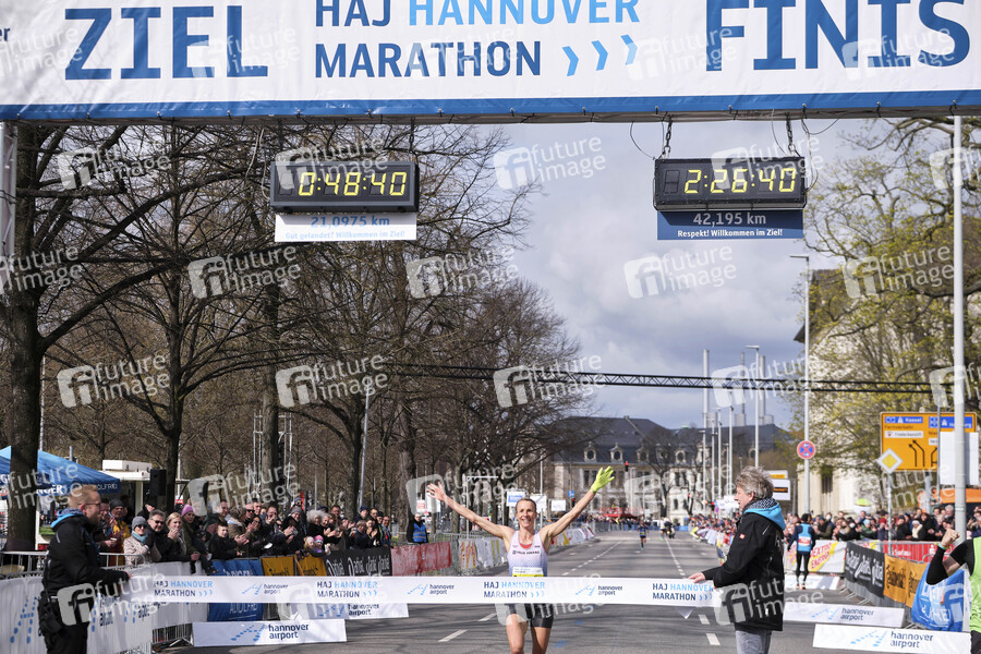 Domenika Mayer (1. Platz) beim 30. HAJ Marathon. Hannover, 03.04.2022