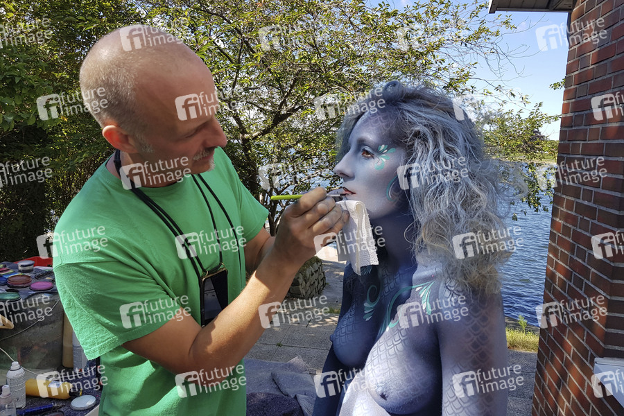 GEEK ART - Bodypainting and Transformaking: Enrico und Model Janina bei der Vorbereitung zum Aquaman und Nixe Photoshooting am Jadebusen. Wilhelmshaven, 08.09.2020 - Ein Projekt des Fotografen Tschiponnique Skupin und des Bodypainters und Transformakers Enrico Lein