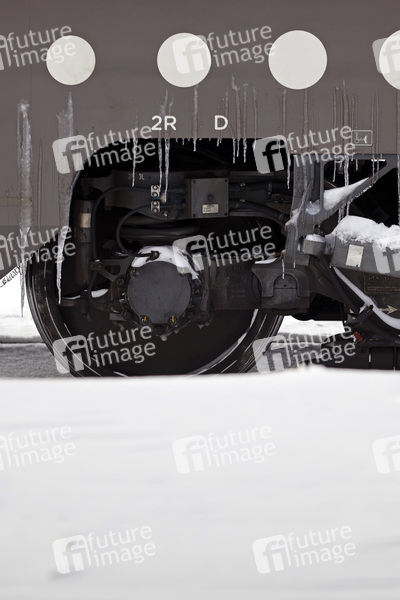 Ein ICE fährt bei Schnee in den HBF Hamm, an seinen Achsen hängen Eiszapfen. Bei Schnee und Eis stehen bei der Deutschen Bahn Spezialtechnik und zehntausende Einsatzkräfte bundesweit bereit, um Bahnsteige und Gleise schnellstmöglich freizuräumen sowie Züge und Loks winterfest zu machen. (Themenbild, Symbolbild) Hamm, 16.02.2021