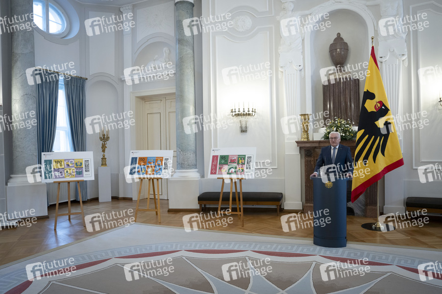 Frank-Walter Steinmeier bei der Übergabe der Wohlfahrtsmarken 2025 durch den Bundesminister der Finanzen an den Bundespräsidenten im Schloss Bellevue. Berlin, 21.02.2025