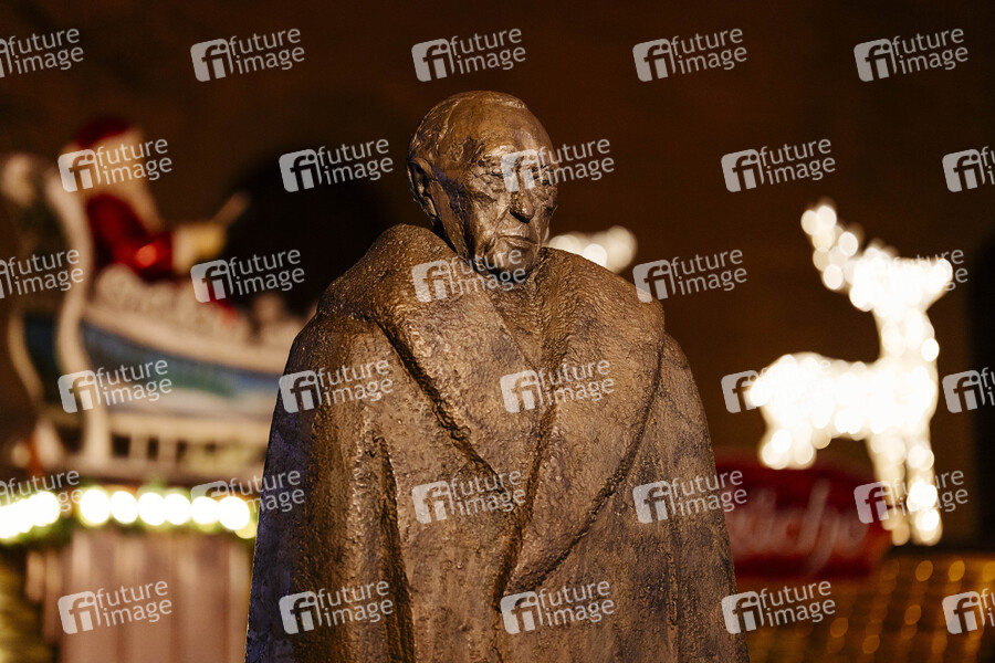 Das Konrad Adenauer gewidmete Denkmal an der Kreuzung Aposteln- und Mittelstraße. Im Hintergrund Weihnachtsbeleuchtung einer Weihnachtsmarkt-Bude. Köln, 06.12.2020