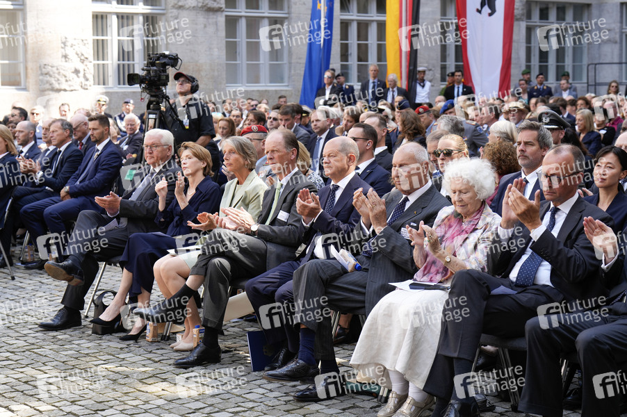 Frank-Walter Steinmeier, Elke Büdenbender, Valerie Riedesel Freifrau zu Eisenbach, Philipp Riedesel Freiherr zu Eisenbach, Olaf Scholz, Berthold Maria Schenk Graf von Stauffenberg, Mechthild Schenk Gräfin von Stauffenberg und Friedrich Merz bei der Gedenkveranstaltung zum 80. Jahrestag des Aufstands gegen Nationalsozialistische Gewaltherrschaft mit Kranzniederlegung auf dem Ehrenhof des Bendlerblocks.Berlin, 20.07.2024