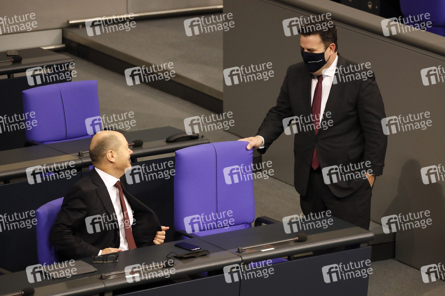 Olaf Scholz und Hubertus Heil bei der Rede von UN-Generalsekretär Guterres anlässlich 75 Jahre Vereinte Nationen im Plenum im Reichstagsgebäude. Berlin, 18.12.2020