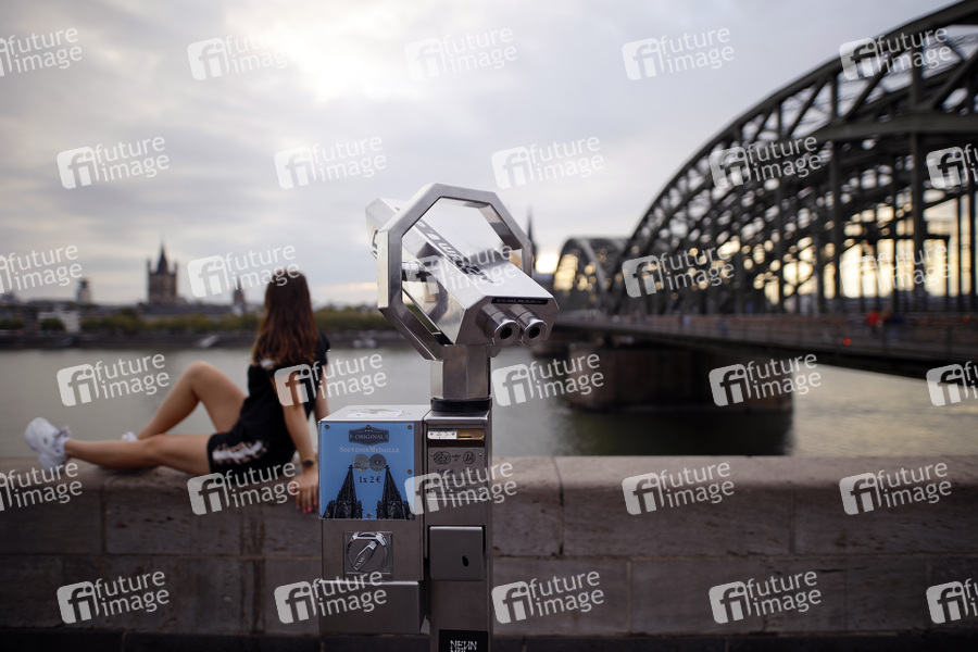 Ausblick, Weitsicht, Aussichten, Weitblick, Tourismus, Sightseeing, Überblick, Fernsicht, Fernglas, Münzfernglas, Münzeinwurf, Aussichtspunkt, Schauen, Beobachten, Beobachtung, Fernrohr, Aussichtsfernrohr, Kölner Skyline, Symbolbild, Symbolfoto